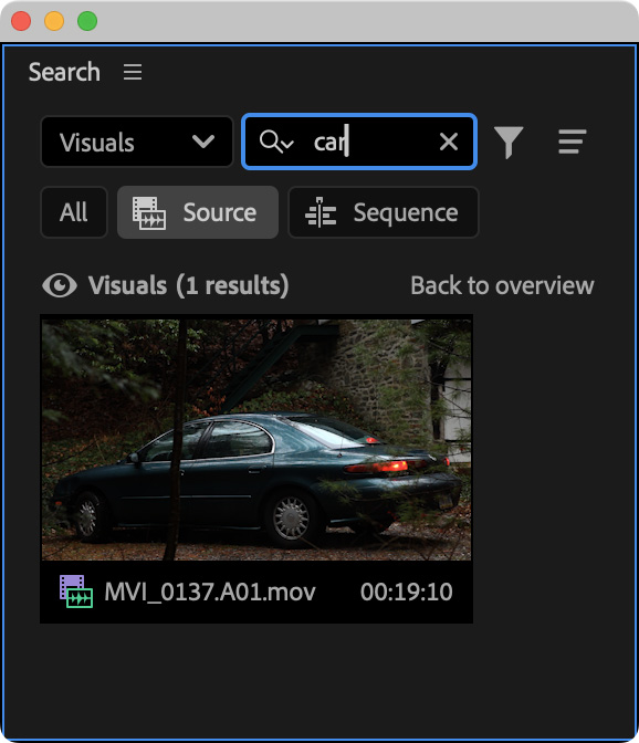 Here’s another example, I’m searching for all visuals of a car. And, it found the clip, even though car is not in the file name. In fact, the file name contains no content information at all.