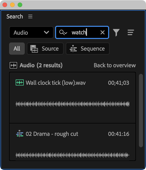 NOTE: You can search on all imported clips (Source), only clips in the timeline (Sequence), or both. This search was on both.