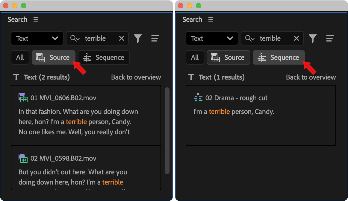 Here I’m searching on text for the word “terrible.” The left panel shows results from searching all clips. The right panel shows results from searching the timeline.