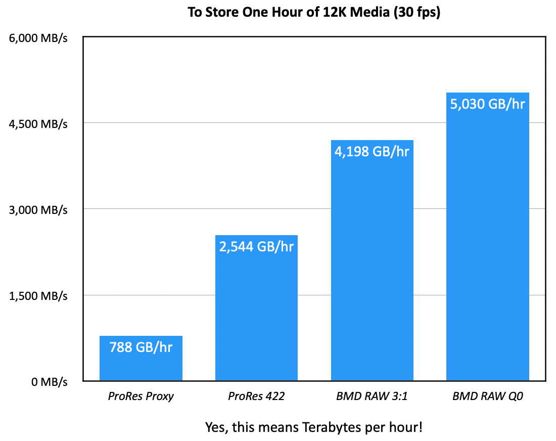 Shooting and editing 12K media will take MASSIVE amounts of storage capacity, along with NVMe SSD speeds. SSD storage continues to come down in price, but is still far more expensive than spinning media.