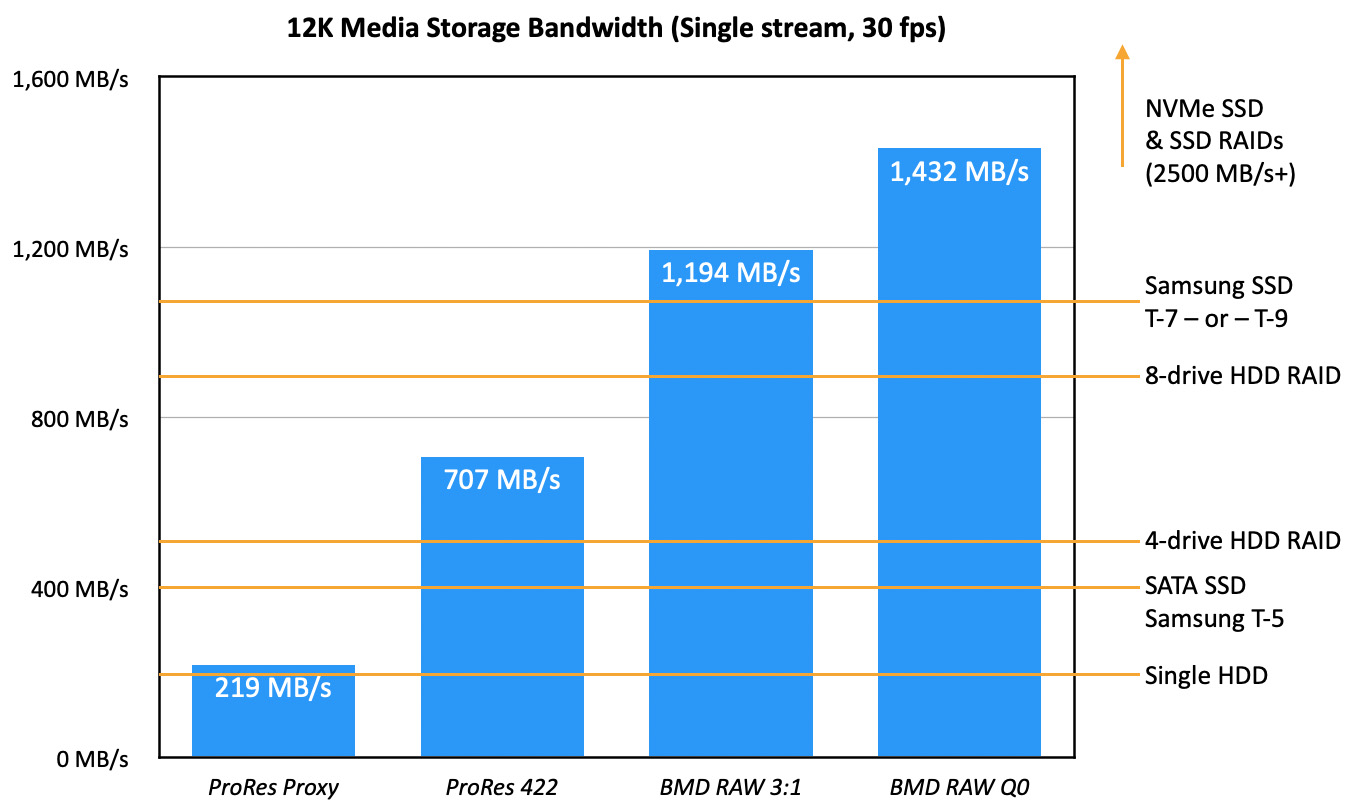 While 700+ MB/second is within reach of 8-drive HDD RAIDs, once you move into 12K media, you really need all-SSD storage. As you’ll see in the charts below, Thunderbolt 3 or faster devices are not required, but really, really helpful.