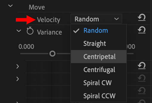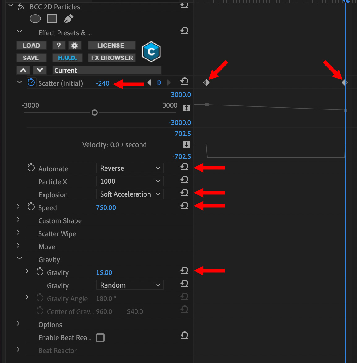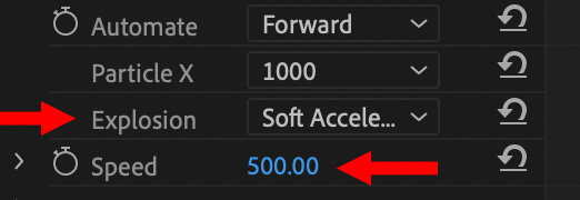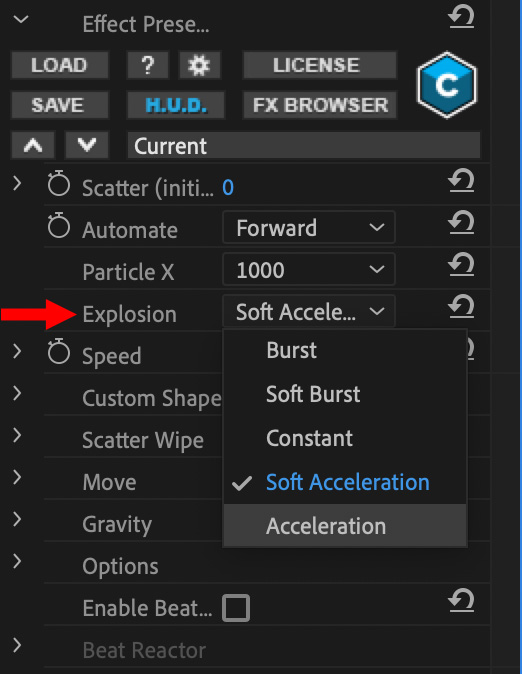 Select the type of particle explosion you want. There are six choices – play with each to see which you like. I like Soft Acceleration and Soft Burst.