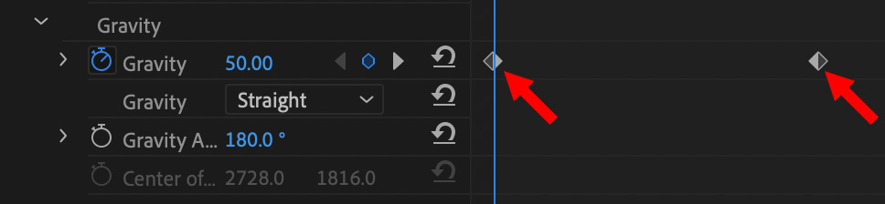 Adjust Gravity from this menu. (It defaults to off, with a setting of 0.) This includes angle and force of the pull, plus the type (straight, centrifugal etc). Note that gravity – like all settings – can be keyframed.