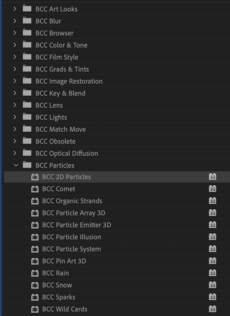 In the Premiere Effects panel, apply BCC Particles > BCC 2D Particles to the selected clip.