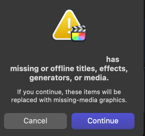 This happened to me in the past to get the [“my project” has missing or offline titles, effects, generators, or media] , but only with third-party effects, never with basic effects that are part of FCP.
