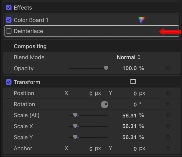 I had no recollection that if you apply Deinterlace from the Inspector under Settings, it will then appear under Effects. Also, I tried to reapply the Deinterlace from Settings, but it doesn’t work anymore (I know my project is Progressive, but before, I was able to use it).