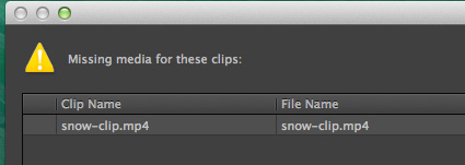 If necessary, relink any missing media. (The snow-clip.mp4 file is stored in the Source folder, inside the Live-Text-Templates folder.)