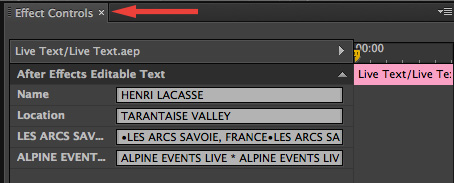 At which point, you can change the text associated with this clip in the Effect Controls panel. Each line of text in the comp is a separate line in the Effect Controls panel. Edit the text as you wish. The changes update instantly.