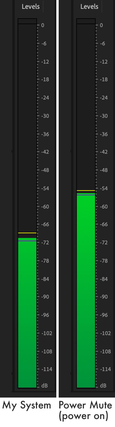 When the Power Mute is connected and powered up using the AC adapter, the noise floor rises to -54 dB. To put this level into perspective, imagine a 0 dB tone. 0 dB equals an audio level at 100%. A noise floor of -54 dB takes that 100% level and reduces it to 0.2%. So, yes, it’s not dead silent, but, no, I’m not bothered by this amount of background noise.