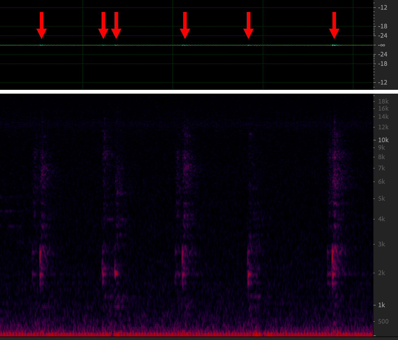 Here’s what audio looks like with my mic connected but without me talking. The red arrows indicate where the switch was pressed. The difference in level when the switch was pressed was about -2 dB, raising the background noise from -54 dB to -52 dB or so.