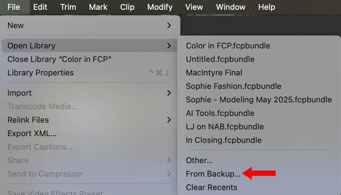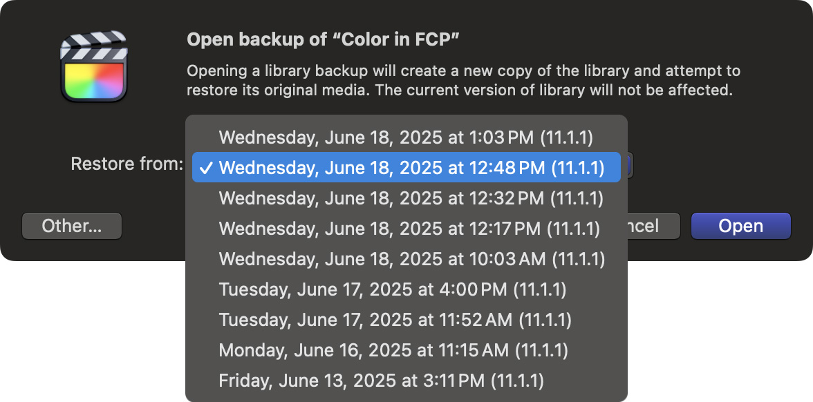 NOTE: This menu displays the date and time a library was saved and the version of Final Cut you were using. In this example, I was using Final Cut Pro 11.1.1.
