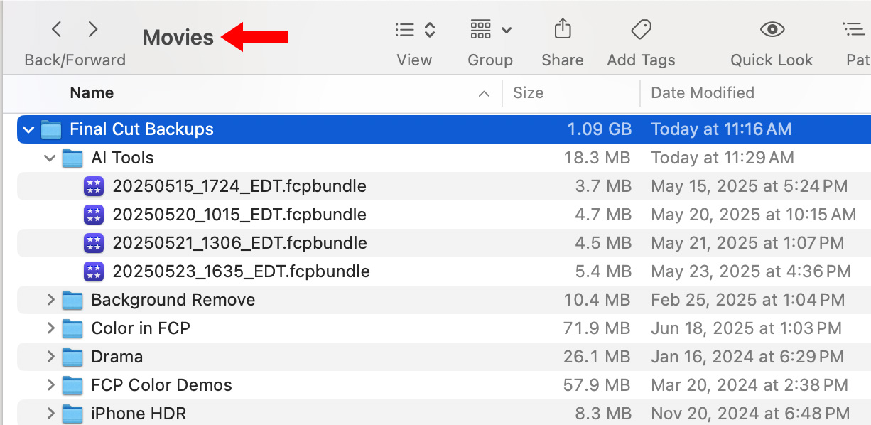 If you deleted the backup folder – say because it was ancient – navigate to the Movies folder and open it so you can see the contents of the Final Cut Backups folder.