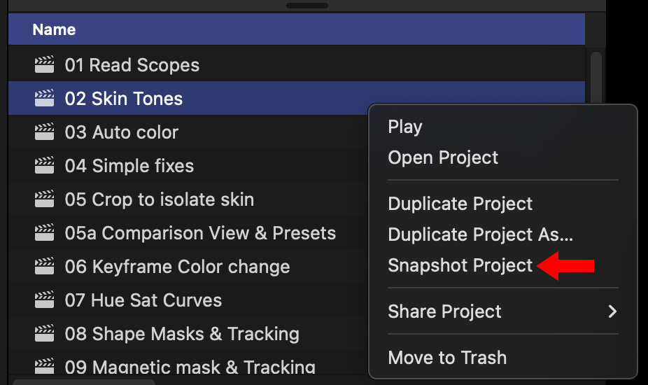 For example, create a snapshot at the end of each editing day. Delete snapshots that become out of date. In the event a single project corrupts, snapshots are the fastest way to recover most of your work.