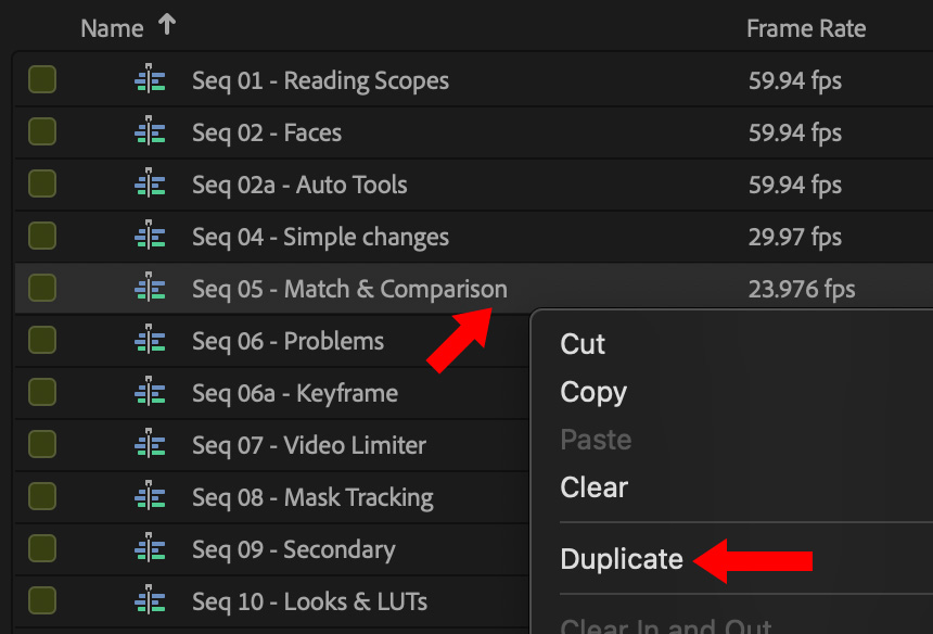 To do so, right-click the sequence you want to backup and choose Duplicate.