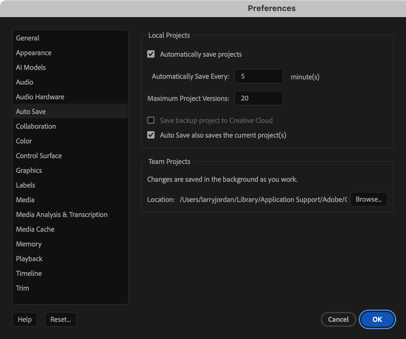 NOTE: You can also save a project to the Creative Cloud. Keep in mind that, if you do so, it will not backup media. Auto-save, regardless of location, does not back up media.