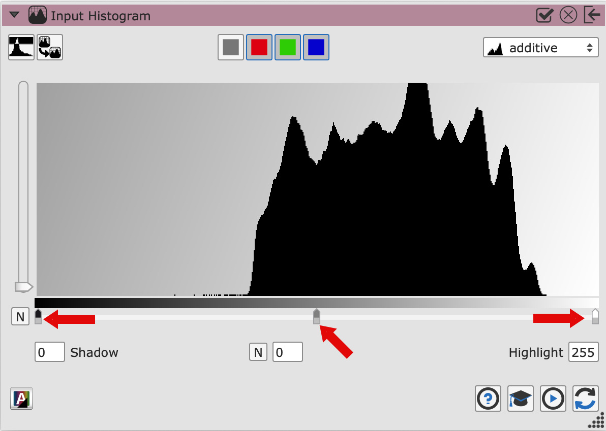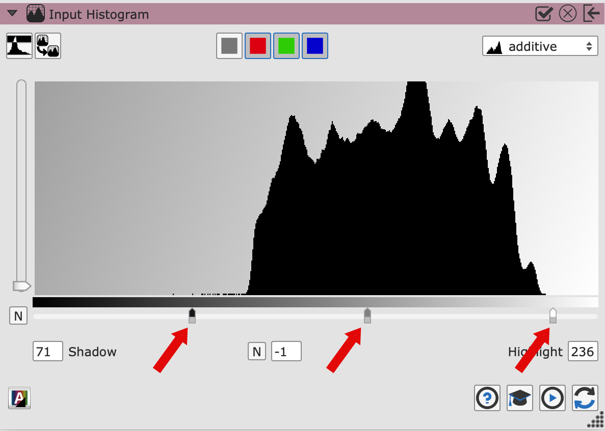 The biggest control we have in scanning is adjusting gray scale values using the Histogram. The left slider controls shadows, the middle slider controls mid-tones and the right slider controls highlights. Pixels outside the left and right sliders are “crushed,” means that all texture detail in those pixels is lost.