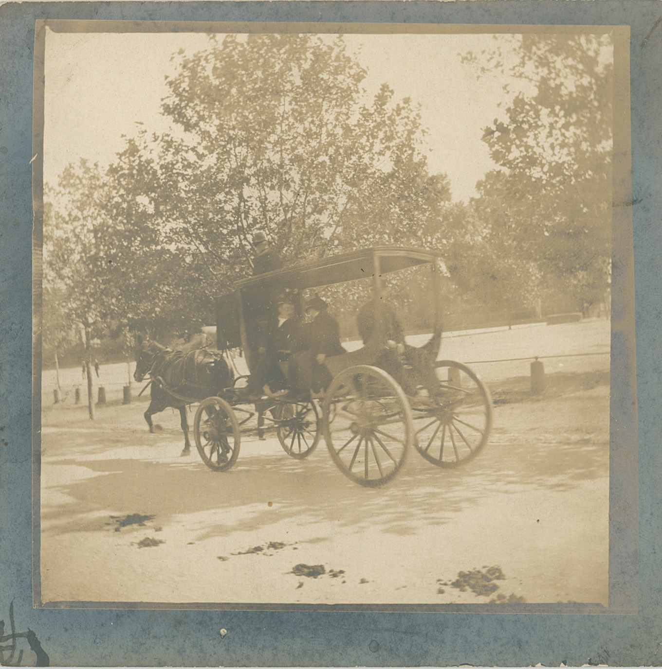 As an experiment, I spent ten minutes in Photoshop cleaning the image; mostly to remove more objectionable dust, damage and artifacts. Here’s the result. Note, that we see all four men in the carriage (one is on top). Plus, two children playing in the park on the left. And, it seems like the man on the right may be sitting on the casket.