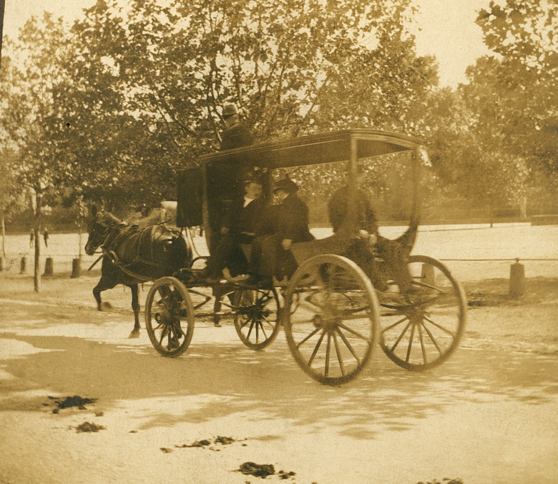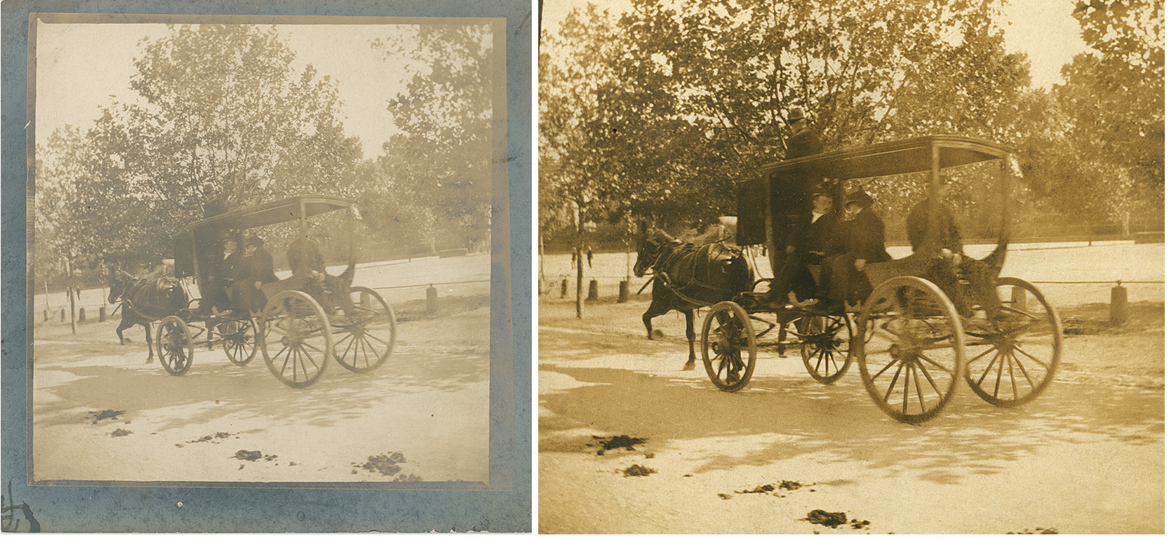 As an experiment, I spent ten minutes in Photoshop cleaning the image; mostly to remove more objectionable dust, damage and artifacts. Here’s the result. Note, that we see all four men in the carriage (one is on top). Plus, two children playing in the park on the left. And, it seems like the man on the right may be sitting on the casket.