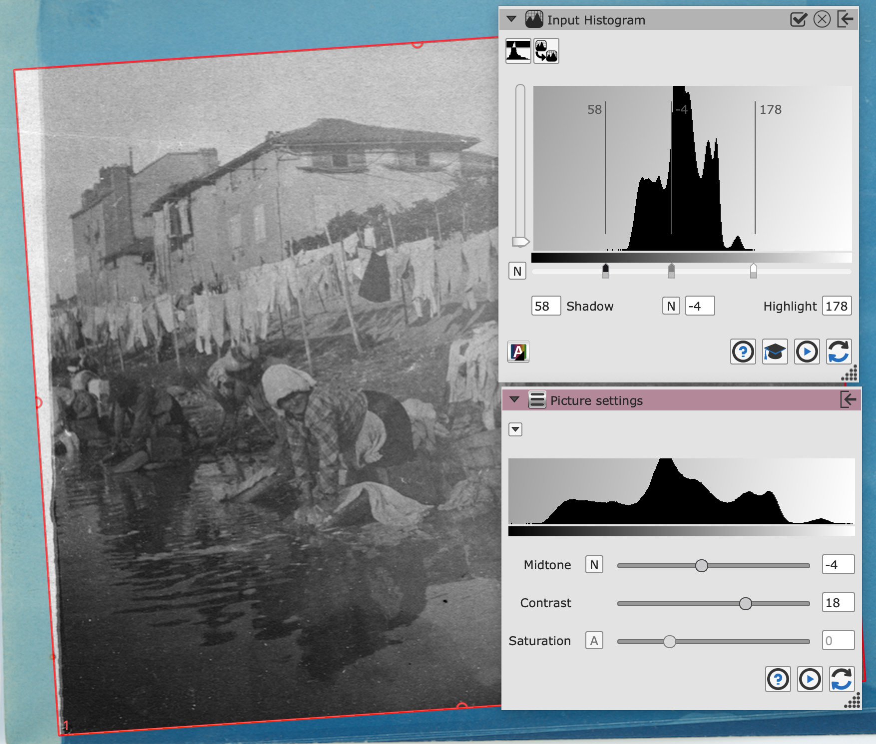 The biggest control we have in scanning is adjusting gray scale values using the Histogram. The left slider controls shadows, the middle slider controls mid-tones and the right slider controls highlights. Pixels outside the left and right sliders are “crushed,” means that all texture detail in those pixels is lost.