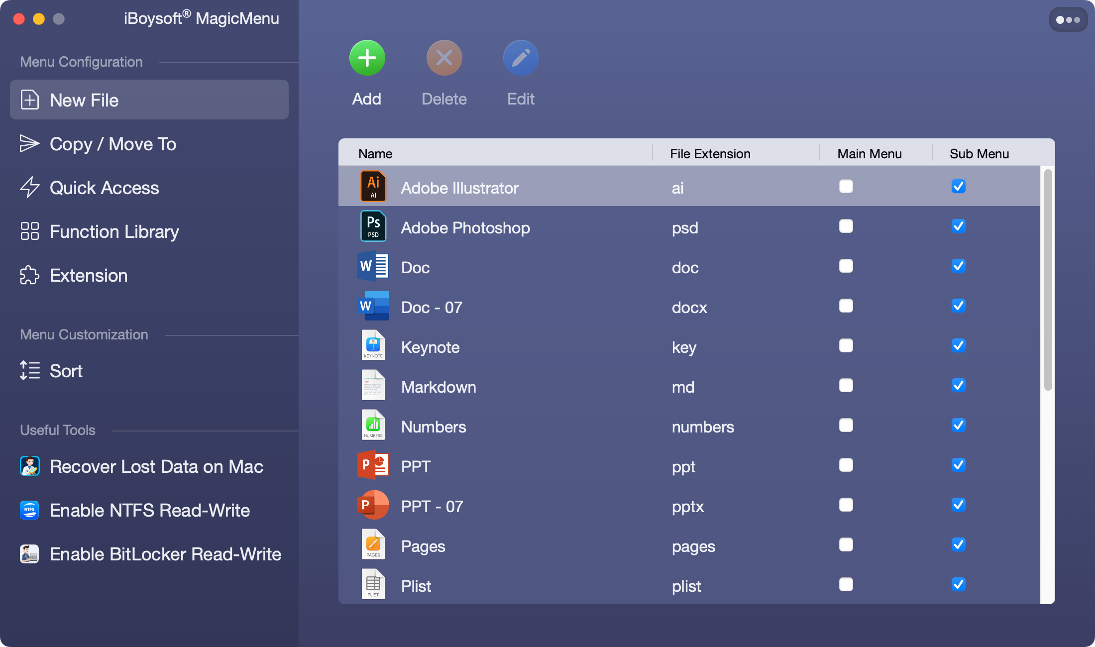 By default, iBoysoft MagicMenu installs 22 file templates when creating new files. If you don’t want a specific template displayed, uncheck it in the right column. (Default templates can’t be deleted, modified or edited.)