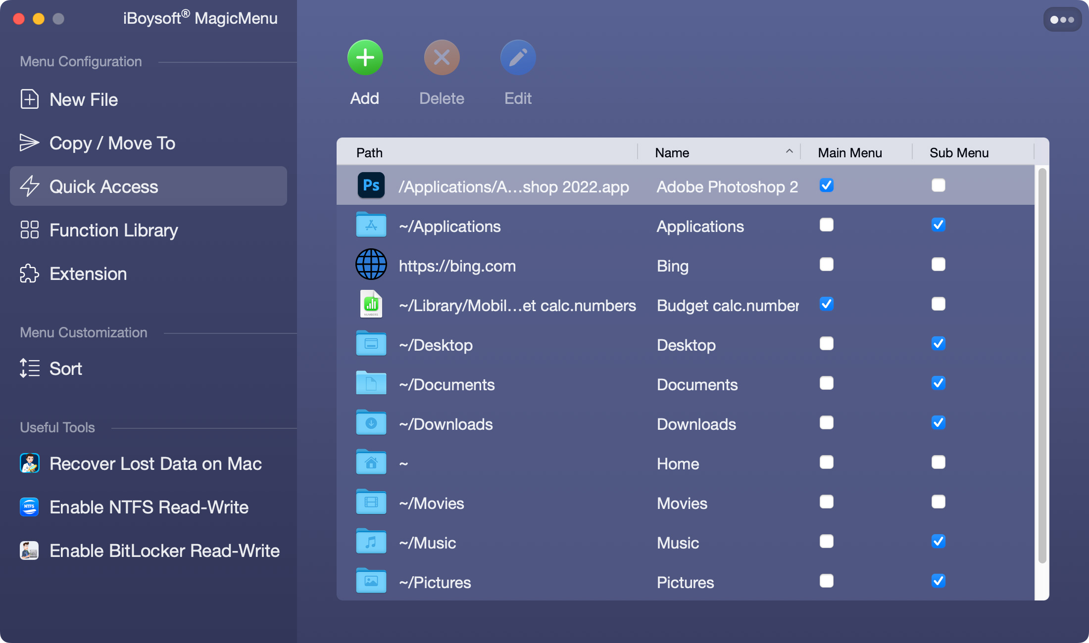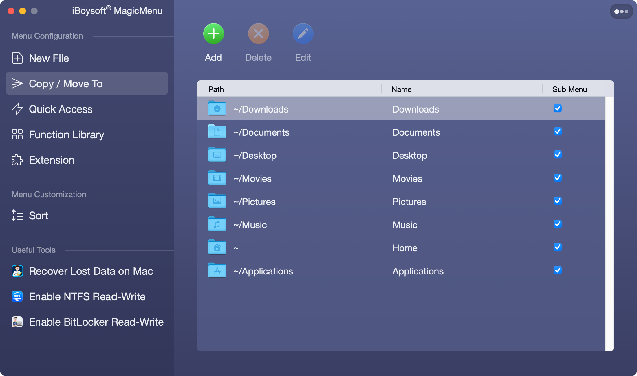 Click the Add button to easily create locations that are multiple folders deep. While you can rename, edit and delete custom locations, you can’t for those supplied by iBoysoft MagicMenu.