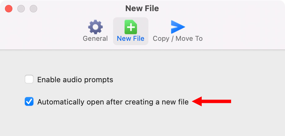 Go to the menu bar icon and select Preferences. These three panels allow you to customize the software. Most of these settings are fine, but in the New File panel, check Automatically open after creating a new file. Since I almost always want to edit whatever new file I create, this single step create-and-open process saves me a lot of time.