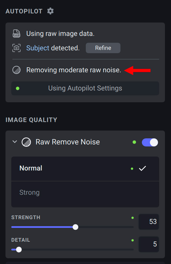The Autopilot (default) settings are excellent. Even better, key settings such as noise removal and sharpening have sliders which can be tweaked to improve results on a picture by picture basis.