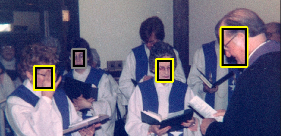 A yellow box indicates a face to be enhanced. Click a box to toggle between enhance or ignore. Then, click the blue Done box at the bottom (not shown) to accept your changes.