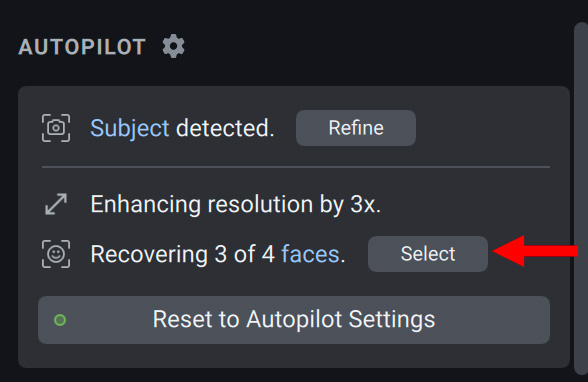 If multiple people are in the frame, click the Select button next to Recovering # faces (red arrow) and select which faces you want to enhance.