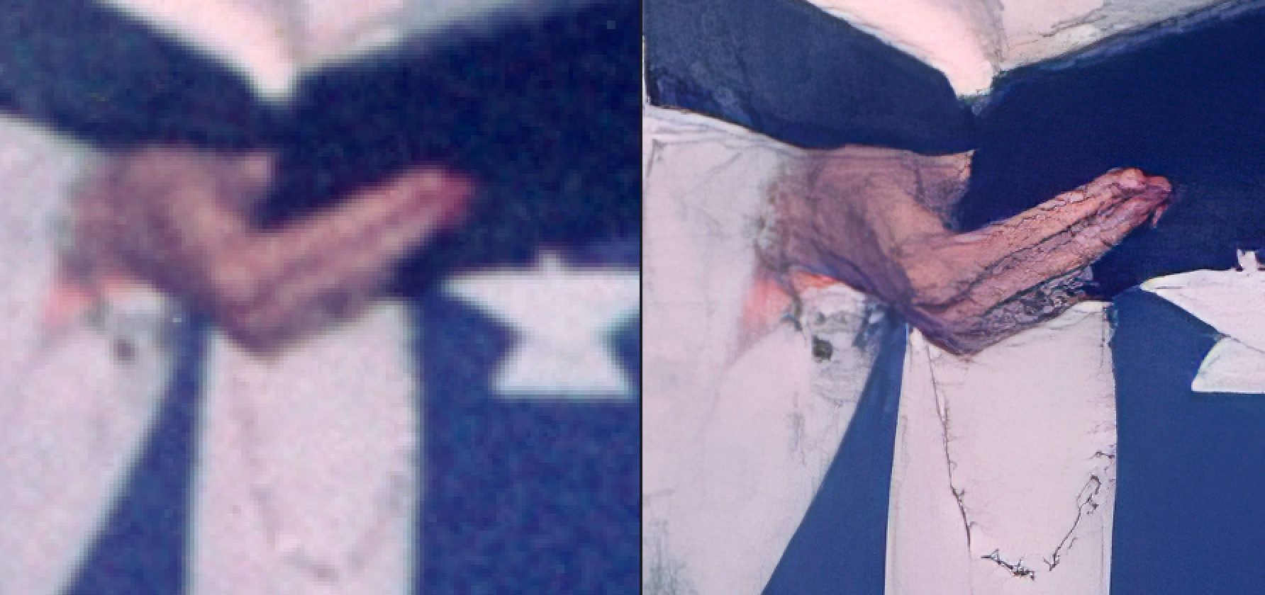 It isn’t perfect; for example, it has problems with some details, like fingers. But it does a remarkable job restoring textural details, like the lace in a woman’s dress or the texture in a man’s suit, which I illustrate below.