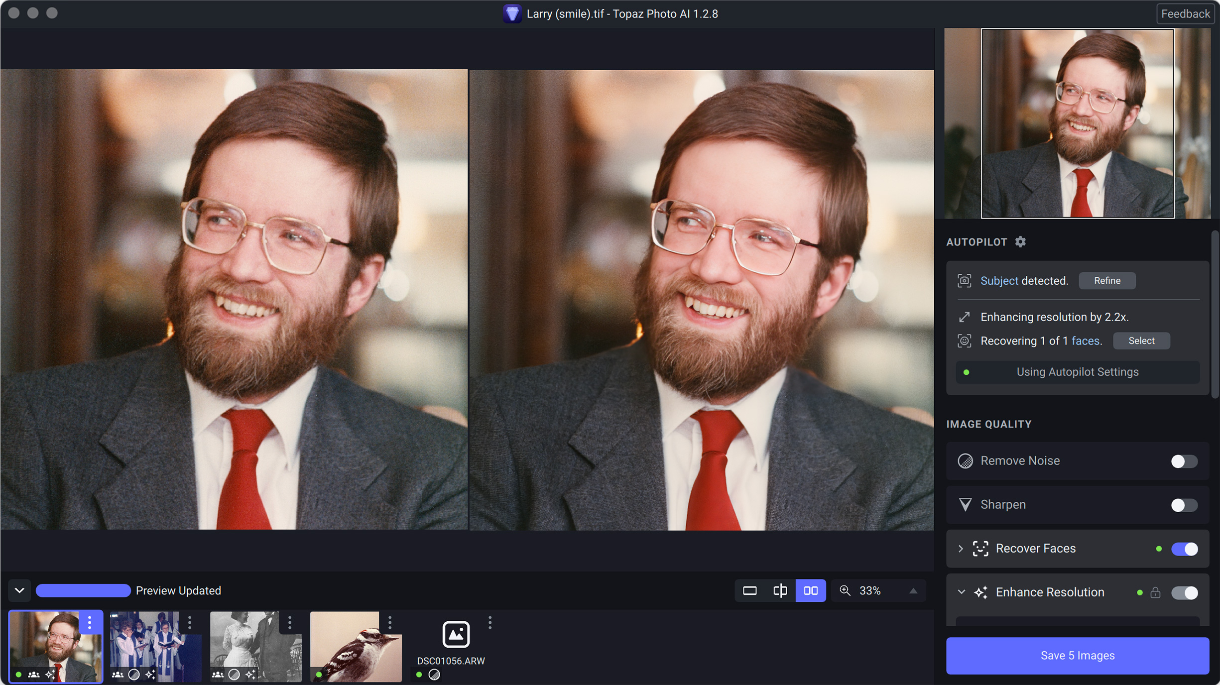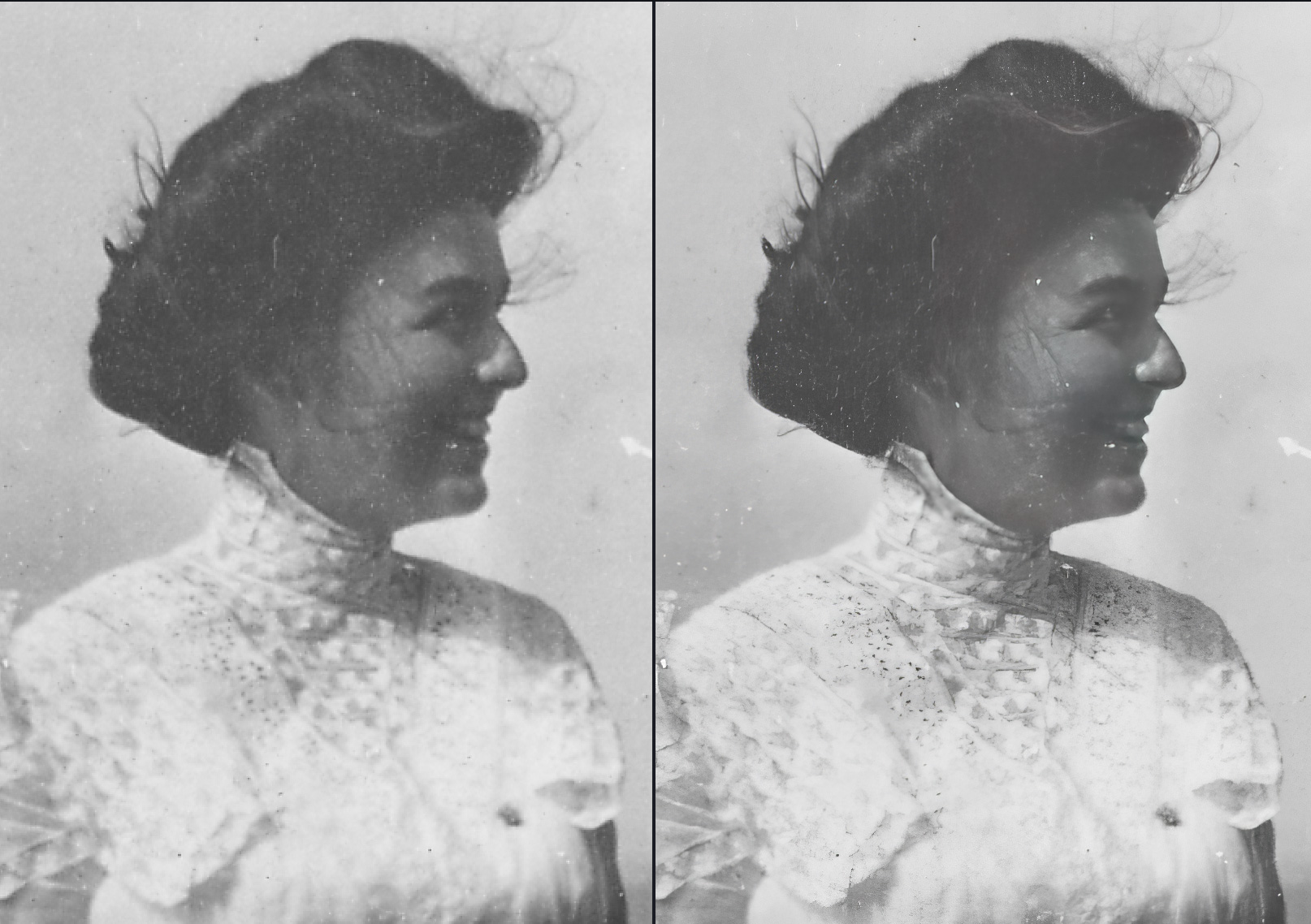 Here’s an example of what Topaz Photo AI can’t do: It won’t remove dust and scratches from an image. While it removes some noise – look at the background to the right of the woman’s face – it doesn’t repair damage to the image itself.