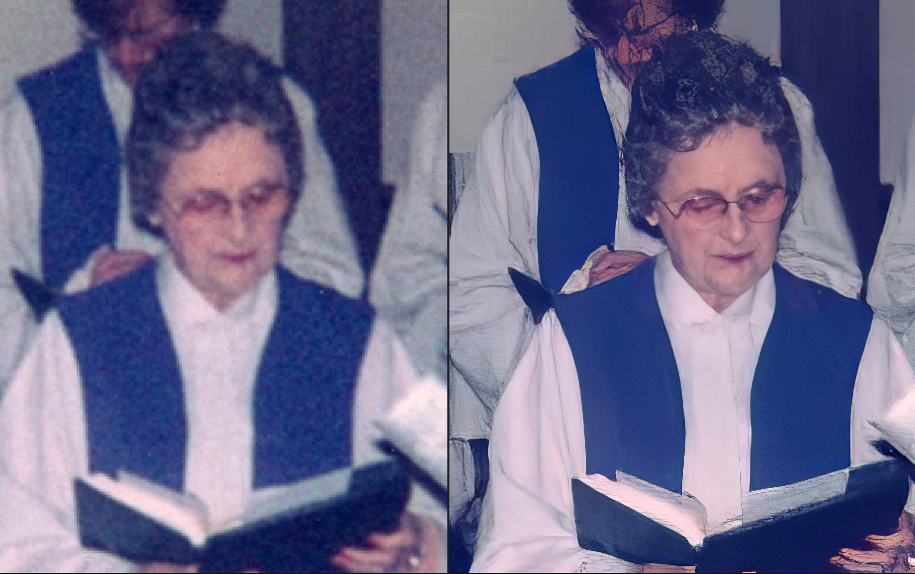 The source image (left) is enlarged so much it displays individual pixels. The right image shows hand artifacts and the loss of texture in the blue stole after enhancement. (Click to see larger image.)