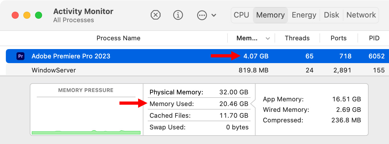 These statistics explain why we don’t need massive amounts of RAM for video editing. The software itself is designed to run comfortably in less memory than you have installed. Where extra RAM does help is in cacheing files, which speeds scrolling, rendering and multicam playback.