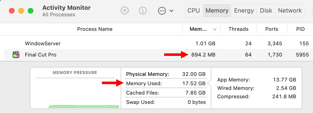 Yet, when we look at the memory allocation displayed during playback in Activity Monitor, Final Cut is using less than 700 MB of RAM! Looking at the distribution chart at the bottom, the total of all apps open at this instant on the computer are using about 17 GB of RAM, with another 7 GB used for cacheing.