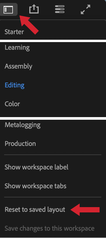 However, at least on my system, the Properties panel is not built into any of the existing workspaces that I use: Essentials, Editing, Color, or Effects. To display the Properties panel, open the workspace you want to add it to, then go to the bottom of the Workspace menu in the top right corner of the interface (top red arrow) and choose Revert to saved layout (bottom red arrow).