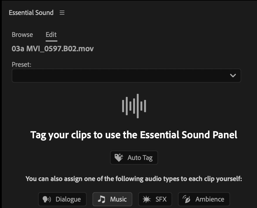 NOTE: In some cases, you may need to define the type of audio clip you selected. There are four choices: Dialogue, Music, SFX, and Ambience.