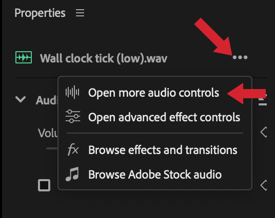 If you need to see more controls in the Properties panel, click the three dots (top red arrow) to reveal this menu. More audio controls are listed at the top (lower red arrow).