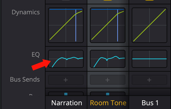 Fairlight makes it easy to apply EQ settings. Double-click the EQ icon (red arrow) for the track you want to adjust.