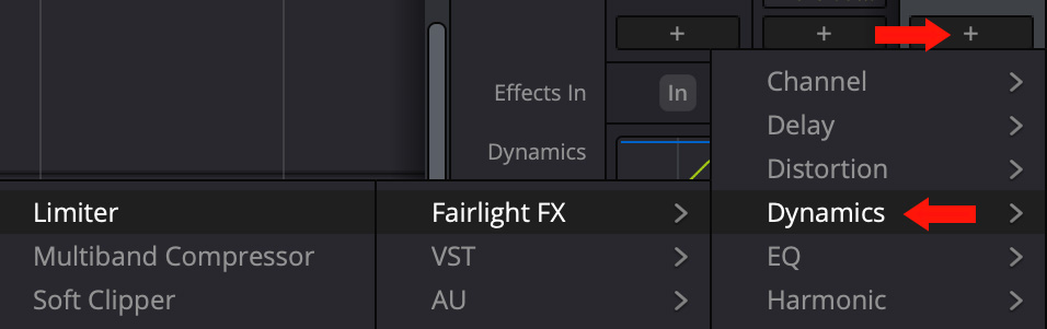 Select Bus 1, or your output bus, then click the Plus icon (top red arrow). In the pop-up menu that appears, choose Dynamics > Fairlight FX > Limiter.