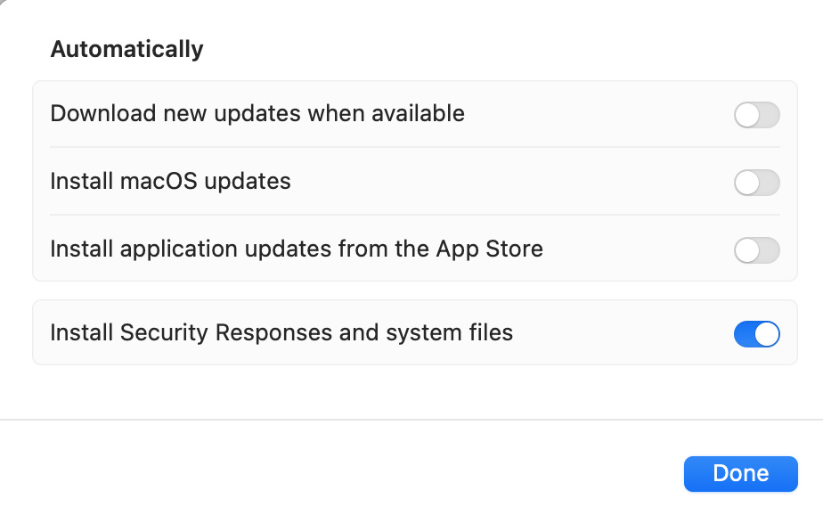 The one exception is security updates. Given the hostile nature of the web these days, updating to the latest security fixes is important to be done quickly. Here are my settings – Apple menu > System Settings > General > Software Update.