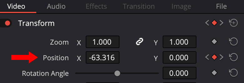 Similar to Premiere, but not the same as Final Cut, Resolve sets keyframes that change the subject’s horizontal position as it moves around the frame. However, unlike Premiere, these keyframes are easy to find and adjust by placing the playhead on the keyframe you want to adjust then change Transform > Position X. (Final Cut sets one position keyframe per clip.)