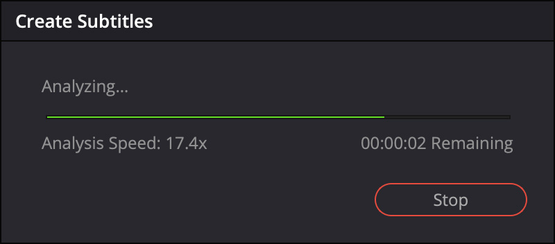 Resolve initializes the system, transcribes the audio, then adds the captions to the timeline.
