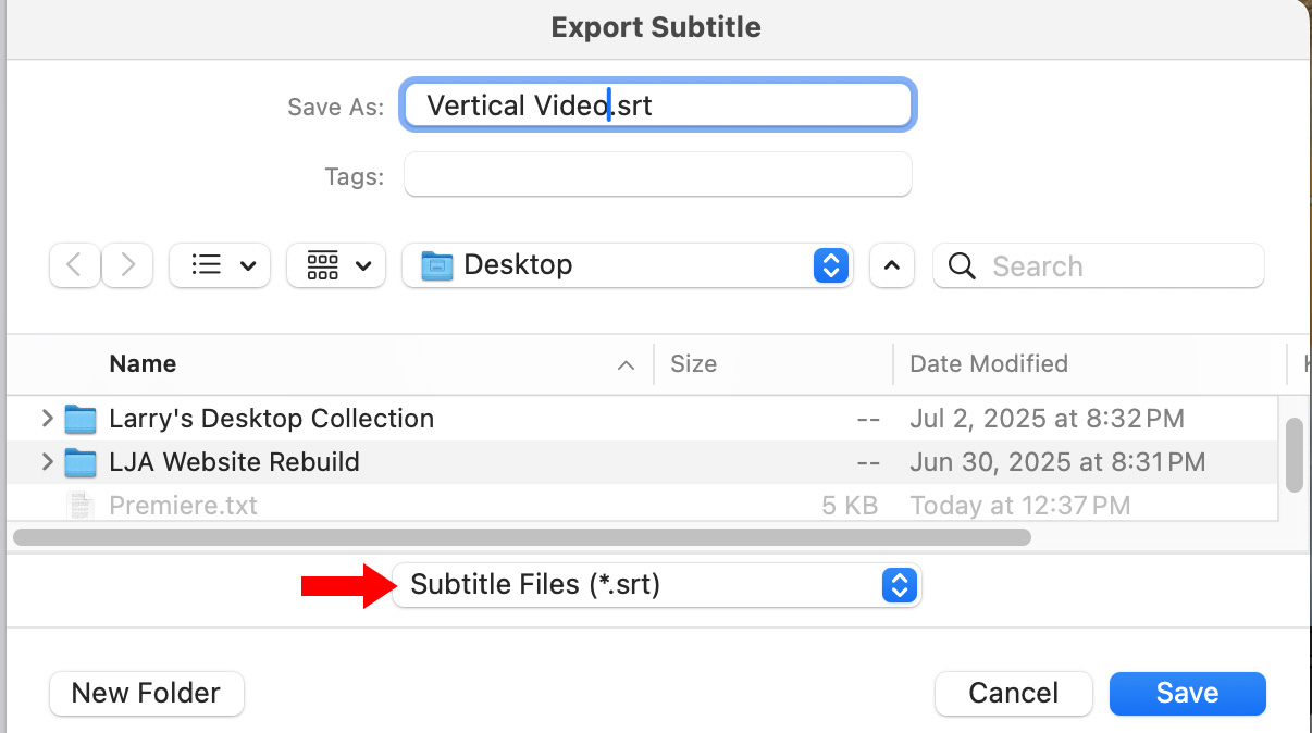 To export a sidecar file, select File > Export > Subtitle. In this dialog, select either SRT or VTT, whichever is preferred by your distributor. (If you don’t know, select SRT.)