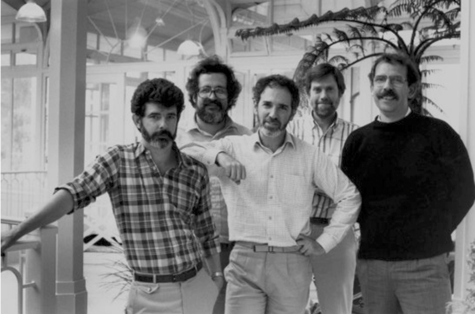 The ol’ gang. From left: George Lucas, Robert Dalva, Matthew Robbins, Hal Barwood, and Walter Murch, adjacent to the library.