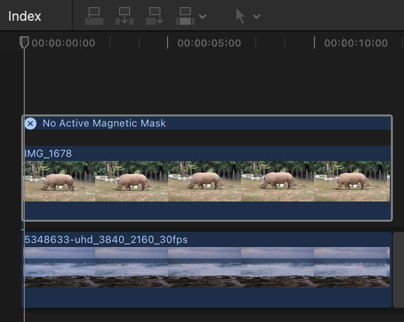 To start, put the background clip in the Primary Storyline, then the clip with the image you want to isolate above it. Here’s what the timeline looks like for the effect I’m illustrating.