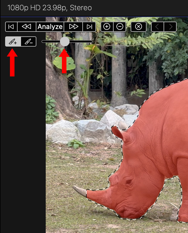 I missed some of his horn and his front toe, so click the Plus Paintbrush (left red arrow) and select any areas you need to include. If the paintbrush circle is too big, drag the slider (right red arrow) to adjust the size. Then, paint to include the new area.