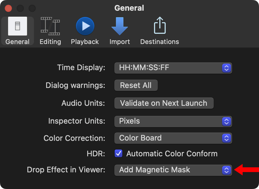 If you don’t see a red highlight as you drag the Magnetic Mask onto the Viewer, make sure that Final Cut Pro > Settings > General > Drop Effect in Viewer is set to Magnetic Mask.