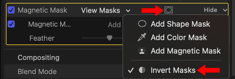 Larry, you can invert the Magnetic Mask. Place your cursor over Magnetic Mask (not the individual Magnetic Mask 1, etc.), and the add shape mask, etc. will appear. Click on it, and an Invert Masks selection will appear. Totally unintuitive.