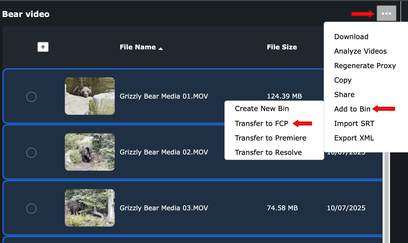 To add files to a bin, select the files you want to transfer, then click 3 dots > Add to Bin and pick the bin you want to use.