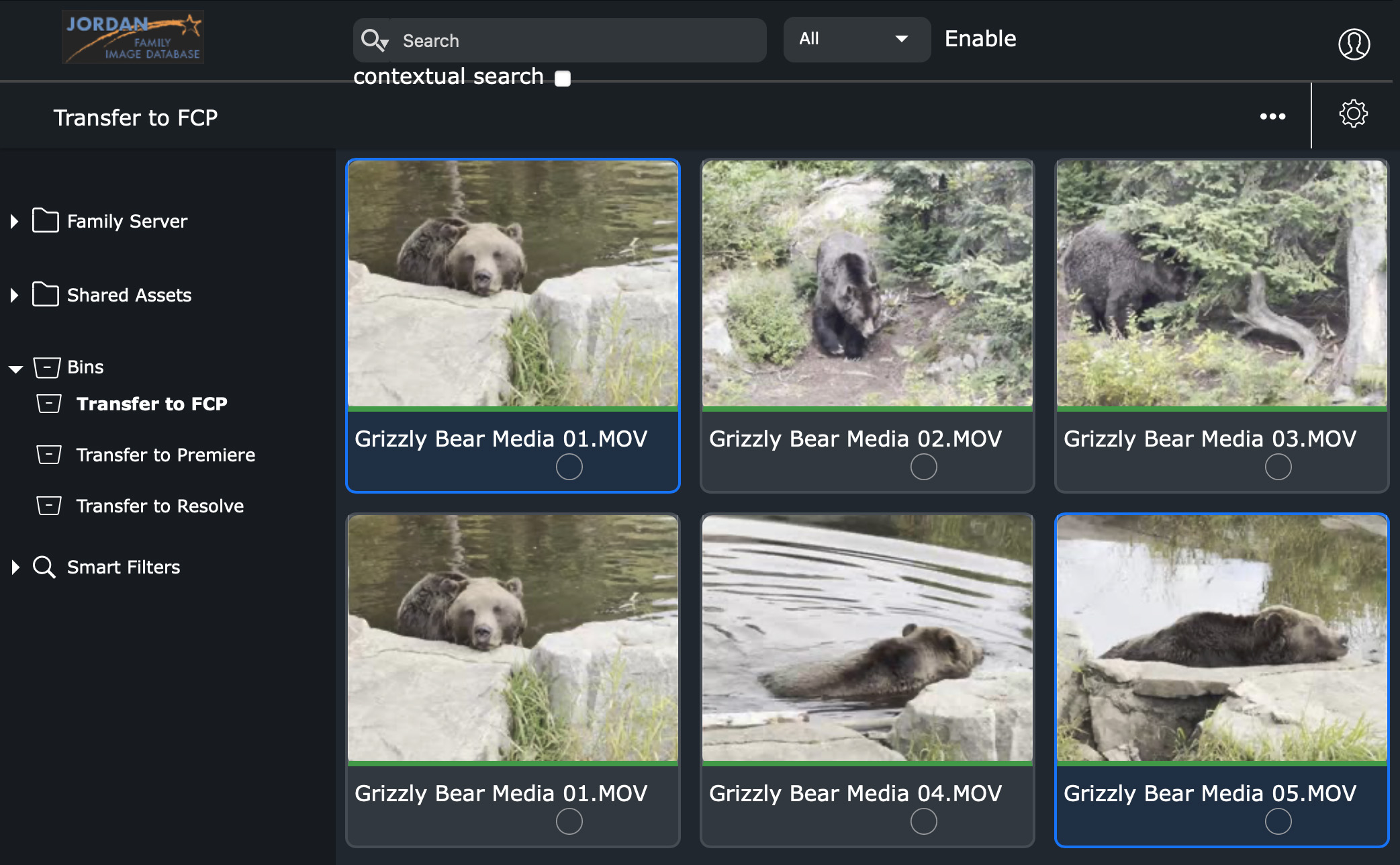 The bins, on the left, were created by me and are used to transfer files between Axle and an NLE. Since I use FCP, Premiere and Resolve, I have a bin for each.